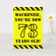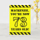 The front of this fun and bold birthday themed greeting card design features an editable name and the message "YOU’RE NOW 73 YEARS OLD!" in black stencil look text on a yellow colored background. The front also features an eye-catching yellow and black stripes pattern at the top and bottom edges. The inside features a personalized birthday greeting message, or could perhaps be cleared and left blank if a message is to be written by hand instead. A personalized birthday card like this might be a fun way to send a message in celebration of somebody’s seventy third birthday. [~Z0000413]