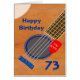 73rd Birthday card for someone who loves the guitar. A close-up of a guitar with a plectrum tucked into the strings. On the plectrum are the words 'You Rock'. A birthday card for a musician who loves the guitar.