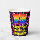 This cheerful and happy birthday themed paper cup design features a large number “73” with a rainbow spectrum gradient inspired pattern, along with the message “Happy 73rd Birthday,”, and an editable name. The background features a pattern of purple, red, and pink heart shapes of various sizes. Happy, friendly paper cups like this might be fun to use at a birthday celebration being held to celebrate somebody’s 73rd birthday. [~Z0000548]