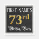 This luxurious and fancy birthday paper napkin design features a custom name and the message “73rd Birthday Party”. The large number “73rd” has a faux/imitation gold-inspired colouring pattern, and the words “Birthday Party” are in opulent script-style text. The background is coloured black by default (although it can be customised). Ornate, elegant paper napkins like this might be used at a birthday party being held to honour somebody’s 73rd birthday. [~Z0000565]
