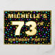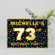The front of this joyful seventy-third birthday celebration/party foil invitation card design features a personalised name, a large number “73rd”, the message “BIRTHDAY PARTY!”, and a border. The background of the front features a fun, colourful star shapes pattern. The back features personalised details about the event, such as the date, time, venue/location, and any other information that may be relevant. Editable invitations like these might be a fun way to invite guests to a birthday gathering being held to honour somebody’s 73rd birthday. [~Z0000600]