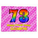 This cheerful and happy 73rd birthday-themed gift bag design features a large number "73" having a rainbow spectrum inspired gradient pattern. It also features the message "Happy 73rd Birthday,", followed by a personalised name. The background features a dark pink and light pink stripes pattern containing loving pink heart shapes. Gift bags like this might be used when wrapping presents or gifts being given in honour of somebody’s seventy third birthday. [~Z0000414]