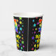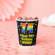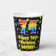 This joyful and colourful birthday-themed paper cup design features a large number “74” with a rainbow spectrum gradient inspired pattern, along with the message “Happy 74th Birthday,”, and a custom name. The background features a colourful pattern featuring many star shapes with different colours and sizes. Colourful, vibrant paper cups like this might be fun to have at a birthday party being held to honour somebody’s seventy fourth birthday. [~Z0000540]
