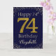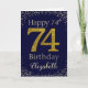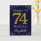 Happy Birthday with simulated golden glitter number 74 set on dark purple blue and framed by faux diamonds and rhinestones. Happy birthday and recipients name in off-white font. Personalize with name or message.