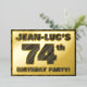 The front of this bold seventy-fourth birthday party foil invitation card features a custom name, a large number “74th”, the message “BIRTHDAY PARTY!”, and a border, all featuring a rustic, yet elegant, faux wood grain look inspired pattern. The back features personalised details about the event, such as the date, time, venue/location, and any other information that may be useful. Customisable invitations like these might be used to invite guests/attendees to a birthday party being held to celebrate somebody’s 74th birthday. [~Z0000595]