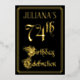 The front of this ornate, elegant, foil seventy-fourth birthday party/celebration invitation design features the message “74th Birthday Celebration” in luxurious script-style text. It also features a custom name. The background of the front is coloured black by default (although it can be customised to a different colour). The back features personalised details about the event, such as the date, time, location, and any other relevant information. Luxurious, opulent, customisable invitations like these might be used to invite guests to a birthday celebration/party being held to honour somebody’s seventy-fourth birthday. [~Z0000589]