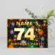 The front of this fun seventy-fourth birthday celebration/party foil invitation card design features an editable name, a large number “74th”, the message “BIRTHDAY PARTY!”, and a border. The background of the front has a bold, colourful pattern inspired by bursting celebratory fireworks. The back features personalised details about the event, such as the date, time, place/venue, and any other information that may be useful. Personalised invitations like these might be a fun way to invite guests to a birthday party/gathering being held in celebration of somebody’s 74th birthday. [~Z0000602]