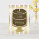 This card for a 75th birthday has a chocolate cake as the focal point, pink decorations and "Happy 75th Birthday" on it.  In the background is a feminine white and gold stripe and pink flowers.  This is simply a lovely card for her 75th birthday.  Copyright Kathy Henis