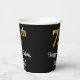 This sophisticated, stylish, and elegant birthday themed paper cup design features a large ordinal number “75th” having an imitation/faux gold-like look, along with the birthday greeting message “Happy 75th Birthday,” and a personalised name in a script-style font. The background is coloured black. Elegant birthday themed paper cups like this might be used at a party celebrating somebody’s 75th birthday. [~Z0000538]