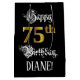 This elaborate and elegant birthday gift bag design features the message “Happy 75th Birthday,”, along with a customisable recipient name. Some of the message is in a luxurious script-style text. The large number “75th” features a faux/imitation gold-inspired look pattern. The background is coloured black. A gift bag like this might be used when giving a gift or present in honour of somebody’s 75th birthday. [~Z0000560]