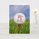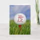 Close up of a white golf ball on a red tee in grass with sky background for 75th birthday.