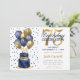 This fabulous men's 75th birthday navy blue cake surprise party invitation featuring a 2-layer navy blue and gold cake with navy blue and gold balloons and the number 75 in gold would be perfect for celebrating your husband, brother, dad, friend, uncle, grandfather, great grandfather. It is traditional and classic while being fresh, modern and contemporary. The back is a coordinating navy blue foil.