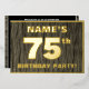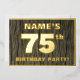 The front of this bold seventy-fifth birthday party foil invitation card features a custom name, a large number “75th”, the message “BIRTHDAY PARTY!”, and a border, all in foil. There is a rustic, yet sophisticated, faux wood grain appearance inspired pattern for the background of the front. The back features personalised details about the event, such as the date, time, location, and any other useful information. Editable invitations like these might be used to invite guests to a birthday gathering being held to honour somebody’s 75th birthday. [~Z0000598]