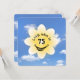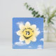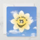 White flower graphic with glowing sunshine, smile, and eyeballs on a blue summer sky background for a 75th birthday party.