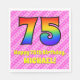 This upbeat and happy 75th birthday themed paper napkin design features a large number "75" having a colourful pattern inspired by the appearance of a rainbow spectrum. It also features the message "Happy 75th Birthday,", and a customisable name. The background features a dark pink and light pink stripes pattern containing loving pink heart shapes. Birthday themed paper napkins like this might be used at a party celebrating somebody’s seventy fifth birthday. [~Z0000417]