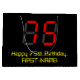 This nerdy and geeky birthday themed gift bag design features a large number "75" having a red seven segment digital display inspired appearance, along with the message "Happy 75th Birthday," and a customisable name in geeky retro style yellow text, on a black coloured background. Personalised gift bags like this might be used when wrapping gifts or presents being given to somebody who is celebrating their seventy fifth birthday. [~Z0000389]