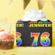 This fun, colourful, and cheerful birthday-themed wrapping paper design features a large number "76" and the message "HAPPY BIRTHDAY,", both having a rainbow spectrum gradient inspired pattern colouring, along with a bold yellow customisable recipient name. The background is coloured black. Fun wrapping paper like this might be used when wrapping a birthday present or gift being given to somebody who is celebrating their seventy sixth birthday. [~Z0000475]