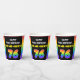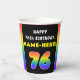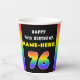 This cheerful and fun birthday paper cup design features a large number “76“ with a multicolor rainbow spectrum inspired gradient pattern, along with the message “HAPPY 76th BIRTHDAY,”, and a custom recipient name. Upbeat birthday themed paper cups like this might be used at a party celebrating somebody’s seventy sixth birthday. [~Z0000639]
