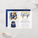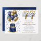 This fabulous men's 77th birthday party invitation featuring a 2-layer navy blue and gold cake with navy blue and gold balloons, the number 77 in gold and shiny blue confetti would be perfect for celebrating your loved one turning 77. It is traditional and classic while being fresh, modern and contemporary. The back is a coordinating navy blue foil.