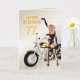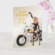 A girl with a motorcycle pointing at the Happy Birthday message.. A great card for the man who loves his bikes!