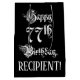 This formal and lavish birthday-themed gift bag design features the message “Happy 77th Birthday,” in luxurious script style text, on a black coloured background. It also has a customisable recipient name. A gift bag like this might be used when wrapping gifts being given to somebody in celebration of their 77th birthday. [~Z0000557]