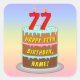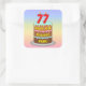 This colourful and fun birthday-themed square sticker design features a cartoon-style depiction of a three-tier birthday cake having number-shaped candles on top showing the age “77“, along with the message “HAPPY 77TH BIRTHDAY,”, and a personalised recipient name. The background features a multi-colour pastel rainbow spectrum inspired gradient pattern. Stickers like these might be used or given out at a party held for somebody who is celebrating their seventy seventh birthday, or perhaps used when preparing gifts/presents or invitations for such an event. [~Z0000624]