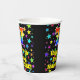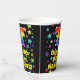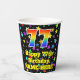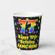 This cheerful and exciting birthday themed paper cup design features a large number “77” with a rainbow spectrum gradient inspired pattern, along with the message “Happy 77th Birthday,”, and a custom name. The background features an exciting and colourful star field inspired pattern. Vibrant, colourful paper cups like this might be fun to have at a birthday celebration/party being held in celebration of somebody’s 77th birthday. [~Z0000540]