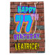 The front of this fun birthday themed gift bag design features the message “HAPPY 77TH BIRTHDAY,” having a vibrant, colourful, graffiti-inspired look, along with a customisable recipient name. The background features a brick wall inspired pattern. A birthday themed gift bag like this might be a fun way to wrap a gift or present being given to somebody who is celebrating their 77th birthday. [~Z0000536]