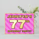 The front of this loving and upbeat seventy-seventh birthday party/celebration foil invitation card design features a customisable name, a large number “77th”, the message “BIRTHDAY PARTY!”, and a border. The background of the front features a joyful pattern with light pink and dark pink stripes and heart shapes. The back features personalised details about the event, such as the date, time, location/venue, and any other relevant information. Customisable invitations like these might be a fun way to invite guests to a birthday party being held to honour somebody’s 77th birthday. [~Z0000603]