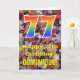 The front of this colourful, autumn-themed, and nature-inspired birthday greeting card design features a large number "77" having a rainbow spectrum gradient inspired pattern. It also features the message "Happy 77th Birthday,", and a custom name. The front features a background depicting rustic fallen autumn leaves. The inside features an editable birthday greeting message, or could perhaps be cleared and left blank if a message is to be written by hand instead. A customisable birthday card like this might be a fun way to acknowledge somebody’s seventy seventh birthday. [~Z0000384]