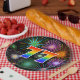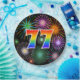 This colourful, fun, and cheerful paper plate design features a large number "77" containing a rainbow spectrum gradient inspired pattern colouring. It also features a exciting and vibrant bursting celebratory fireworks inspired pattern. It has a black coloured background. Fun paper plates like this might be used at somebody’s 77th birthday celebration, a seventy seventh anniversary party, or some other 77th event. [~Z0000490]