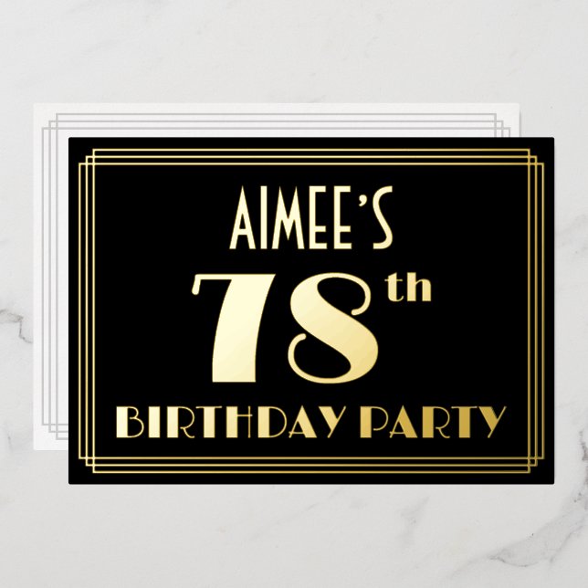 The front of this 1920s-1930s style inspired seventy-eighth birthday celebration/party foil invitation features a customisable name, a large art deco style inspired number “78th”, the message “BIRTHDAY PARTY”, and a border pattern consisting of lines. The front also features a black-coloured background by default, but it can be customised to a different colour if desired. The back features personalised details about the event, such as the date, time, venue, and any other important information. Elegant, luxurious, customisable invitations like these might be used to invite guests to a birthday gathering being held in celebration of somebody’s 78th birthday. [~Z0000591]