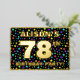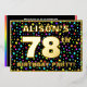 The front of this vibrant and eye-catching seventy-eighth birthday party/celebration foil invitation card design features a personalised name, a large number “78th”, the message “BIRTHDAY PARTY!”, and a border. The background of the front features a joyful, colourful pattern of star shapes. The back features personalised details about the event, such as the date, time, location, and any other information that may be important. Customised invitations like these might be a fun way to invite attendees to a birthday gathering/party being held to honour somebody’s 78th birthday. [~Z0000600]
