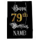 This fancy and luxurious birthday gift bag design features the message “Happy 79th Birthday,”, along with a personalised recipient name. Some of the message is in an opulent script-style text. The large number “79th” features a faux/imitation gold-inspired look pattern. The background is coloured black. A giftbag like this might be used when giving a gift or present in honour of somebody’s seventy ninth birthday. [~Z0000560]