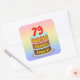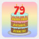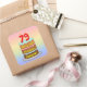 This colourful and upbeat birthday-themed square sticker design features a cartoon-style depiction of a three-tier birthday cake having numeral-shaped candles on top showing the number “79“, along with the message “HAPPY 79TH BIRTHDAY,”, and a personalised recipient name. The background has a multi-colour pastel rainbow spectrum inspired gradient pattern. Birthday themed stickers like these might be distributed or used at a party celebrating somebody’s 79th birthday, or perhaps used when preparing invitations or presents/gifts for such an event. [~Z0000624]