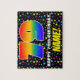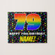 This upbeat and exciting birthday jigsaw puzzle design features a large number “79” with a multicolored rainbow spectrum inspired gradient pattern, along with the message “HAPPY 79th BIRTHDAY,”, and a customisable recipient name. The background features an eye-catching, colourful star field pattern. A bold, personalised birthday puzzle like this might be given in celebration of somebody’s seventy-ninth birthday. [~Z0000607]