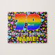 This eye-catching and colourful birthday jigsaw puzzle design features a large number “79” having a multicolored rainbow spectrum inspired gradient pattern. It also features the message “HAPPY 79th BIRTHDAY,”, and an editable recipient name. The background has a cheerful, colourful, loving hearts pattern. A fun, customised birthday puzzle like this might be a fun way to send birthday wishes to somebody who is celebrating their seventy-ninth birthday. [~Z0000611]