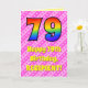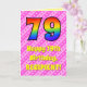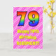 The front of this upbeat and happy 79th birthday-themed greeting card design features a large number "79" having a colorful pattern inspired by the appearance of a rainbow spectrum. It also features the message "Happy 79th Birthday,", followed by an editable recipient name. The background of the front features a light pink and dark pink stripes pattern containing loving pink heart shapes. The inside features a custom birthday greeting message, or could perhaps be cleared and left blank if a message is to be written by hand instead. A custom birthday card like this might be a fun way to send birthday wishes to somebody who is celebrating their seventy ninth birthday. [~Z0000416]