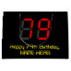 This fun and nerdy birthday themed gift bag design features a large number "79" having a red seven segment digital display inspired look, along with the message "Happy 79th Birthday," and an editable name in geeky retro style yellow text, on a black coloured background. A personalised gift bag like this might be used for wrapping gifts or presents being given to somebody who is celebrating their seventy ninth birthday. [~Z0000389]