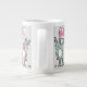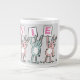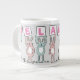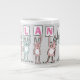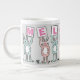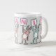 Cute baby rabbits on a coffee mug. Fun Rabbit Design personalised Mug for someone with a 7 Letter Name. Fun pinks and white Mug with illustration of Rabbits in pink and blue. The rabbits are holding up cards to spell out the name.