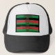 A Kwanzaa hat that states the seven principles of the holiday and their meaning in the colours of green, black and red