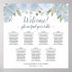 This beautiful seating chart, designed specifically for a wedding, showcases a rustic and bohemian-inspired aesthetic with hand-painted watercolor elements such as roses, blossoms, and a variety of flowers in a dusty blue colour scheme. The chart is divided into 7 tables, with room for 70 guests to be seated at 10 seats per table. The title, written in elegant script calligraphy, welcomes guests and guides them to find their assigned table. Additionally, the chart includes space for the names of the couple and their wedding date, making it a lovely and functional way to greet guests and assist them in locating their seats at the reception.