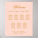 A simple wedding seating chart with 7 tables. The background is blush pink, the text is golden. The word Welcome in the upper part and the names of the bride and groom are written in an elegant calligraphic script, the rest in caps.