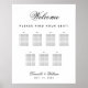 A simple, minimalist wedding seating chart with 7 tables. The background is white, the text is black. The word Welcome in the upper part and the names of the bride and groom are written in an elegant calligraphic script, the rest in caps.