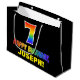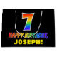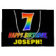 This fun, cheerful, and colourful birthday themed gift bag design features a large number "7" and the message "HAPPY BIRTHDAY,", both having a rainbow spectrum gradient inspired pattern colouring, along with a bold yellow customisable recipient name. The background is coloured black. A fun gift bag like this might be used when giving a gift or present in honour of somebody’s seventh birthday. [~Z0000477]
