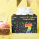 This fun, vibrant, and colourful birthday-themed wrapping paper design features a large number "7" having a rainbow spectrum gradient inspired pattern. It also features the message "Happy 7th Birthday,", and a personalised name. Part of the background has a colourful music notes and symbols pattern. Wrapping paper like this might be used when wrapping gifts being given to somebody in celebration of their 7th birthday. [~Z0000422]