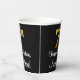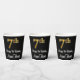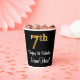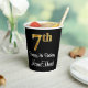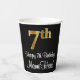 This sophisticated, elegant, and luxurious birthday themed paper cup design features a large ordinal number “7th” having a faux/imitation gold-like look, along with the birthday greeting message “Happy 7th Birthday,” and a custom name in a script-style font. The background is coloured black. Birthday themed paper cups like this might be a fun way to celebrate somebody’s 7th birthday. [~Z0000538]
