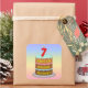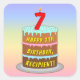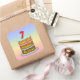 This cheerful and colourful birthday square sticker design features a cartoon-style depiction of a three-tier birthday cake having a numeral-shaped candle on top showing the number “7“, along with the message “HAPPY 7TH BIRTHDAY,”, and a custom recipient name. The background has a multi-colour pastel rainbow spectrum inspired gradient pattern. Stickers like these might be used or given out at a party held in celebration of somebody’s 7th birthday, or perhaps used when wrapping gifts/presents or preparing invitations for such an event. [~Z0000624]