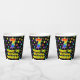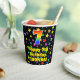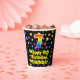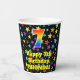 This exciting and colourful birthday paper cup design features a large number “7” with a rainbow spectrum gradient inspired pattern, along with the message “Happy 7th Birthday,”, and a customisable name. The background features a multicolored pattern featuring many star shapes with different colours and sizes. Vibrant, colourful paper cups like this might be fun to have at a birthday celebration/party being held to honour somebody’s 7th birthday. [~Z0000540]
