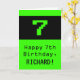 This nerdy and geeky birthday-themed greeting card design features a large green classic video game style number "7" on the front. It also features the birthday greeting message "Happy 7th Birthday,", and a personalised name. The inside features a customisable birthday greeting message, or could perhaps be cleared and left blank if a message is to be written by hand instead. A nerdy customisable birthday card like this might be a fun way to send a message in celebration of somebody’s seventh birthday. [~Z0000430]